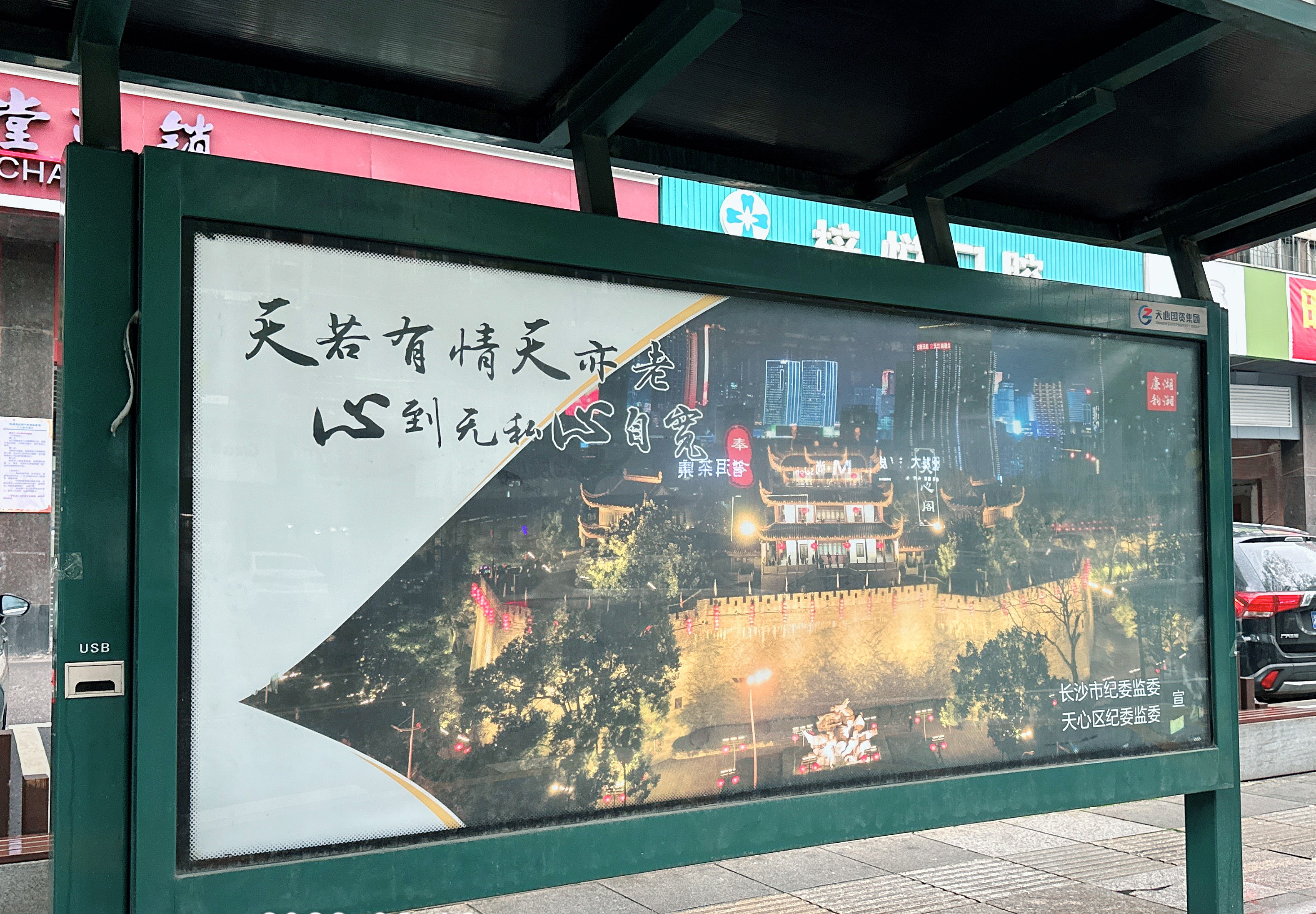 “天若有情天亦老,心到無(wú)私心自寬”?!苯?,在天心區白沙廣場(chǎng)候車(chē)亭,正在等公交車(chē)的李大爺被一幅宣傳畫(huà)吸引,他喃喃地念著(zhù),聲旁的孫子說(shuō):“爺爺,這是我們之前去過(guò)的天心閣,真漂亮啊?!?nbsp;